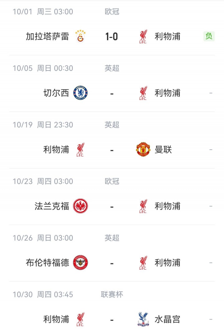 本周末,利物浦将在联赛中对阵切尔西,后者联赛碰到两连败。之后插足海外比赛日,10月下半月,利物浦又将连战曼联、法兰克福、布伦特福德和水晶宫。