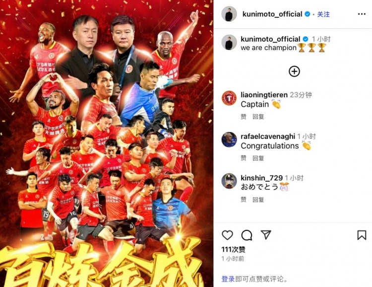 赛后辽足日本外助国本宜裕更新社媒,晒出了球队夺冠的海报,并配文写说念:“咱们是冠军!”