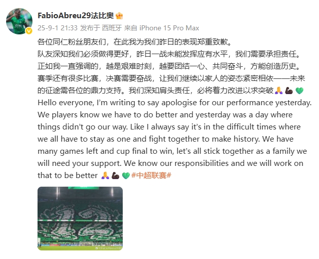 09月01日讯 国安外助法比奥社媒发文,为昨天球队0-6输给泰山的惨败向球迷说念歉。