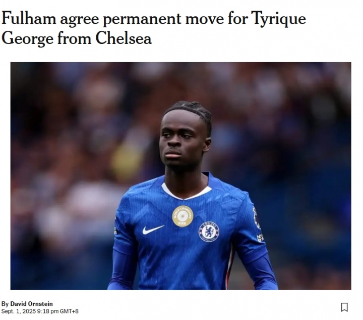 奥恩斯坦暗示,乔治将以遥远转会体式从切尔西加盟富勒姆。这笔交往的总数达到2200万英镑,并包含二次转会分红要求。富勒姆已与球员就五年合约终了左券,后续将安排体检。