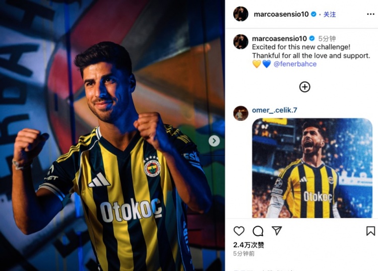 当天阿森西奥在社媒晒出了我方身穿费内巴切球衣的亮相照,并配文写说念:“很欢笑迎来此次全新的挑战!感谢你们的爱与因循。@费内巴切”