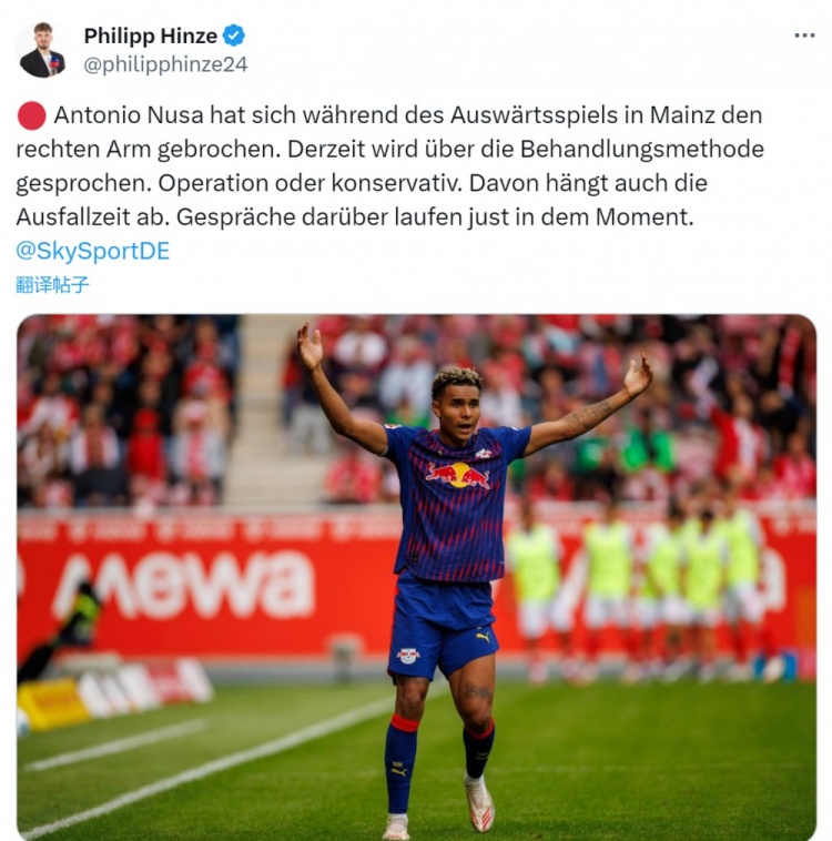 Philipp Hinze败露,努萨在对阵好意思因茨的比赛中右臂骨折,当今正在权衡调解决策,是选拔手术仍是保守调解,这也将决定他的缺席本领。