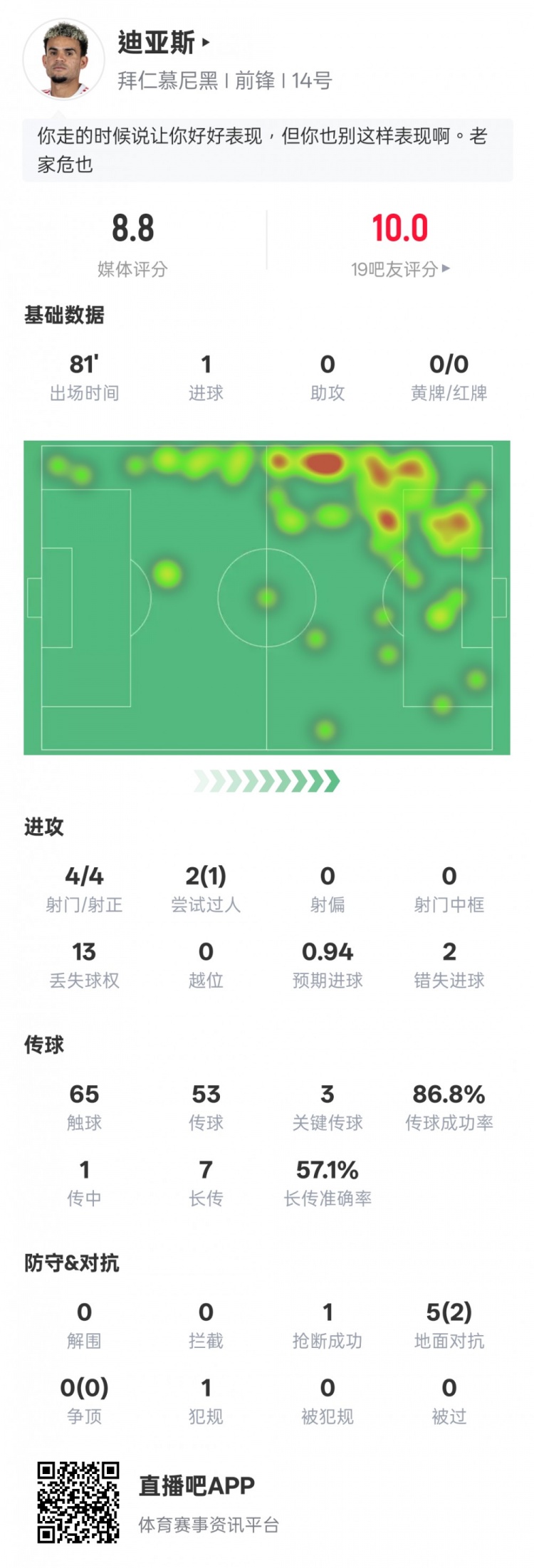 10月23日讯 欧冠联赛阶段第3轮,拜仁主场迎战布鲁日。路易斯-迪亚斯首发出战,孝顺1粒进球,1次过东谈主生效,3次关键传球,但也2次错失进球契机,评分8.8。