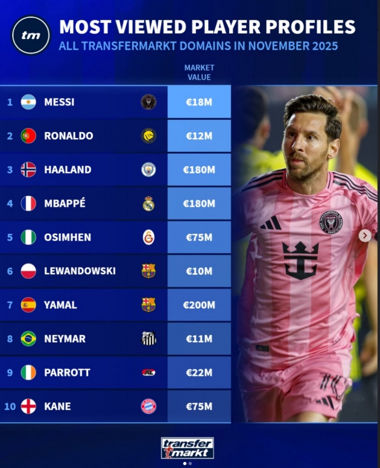 12月3日讯 德转列出了11月份球员页面浏览量名次,前三轮番为梅西、C罗、哈兰德。