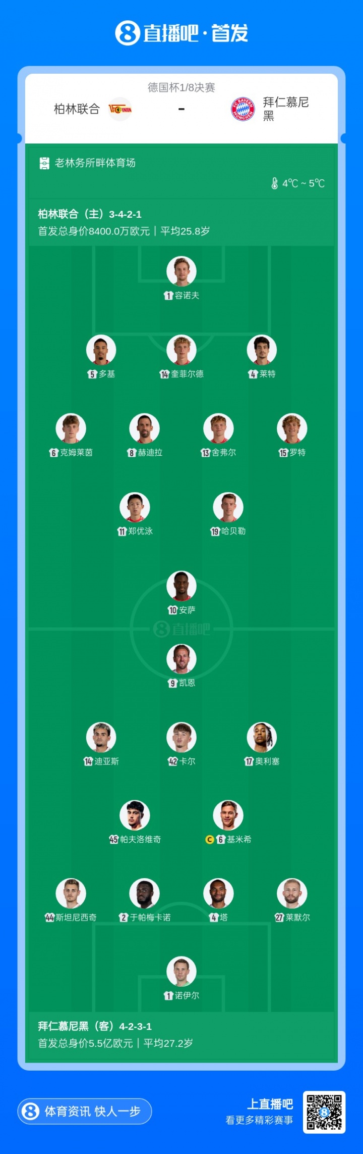 德国杯-柏林聚合vs拜仁首发:凯恩、迪亚斯、奥利塞、卡尔先发