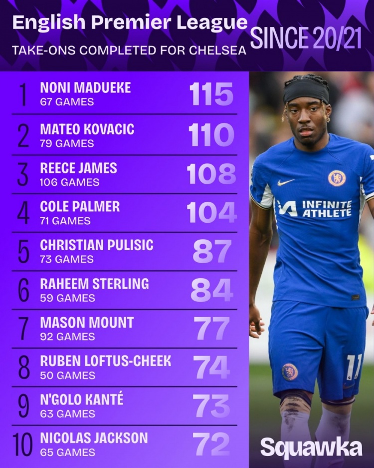 近5年蓝军过东说念主榜:马杜埃凯压科瓦西奇居首,詹姆斯&帕尔默在列