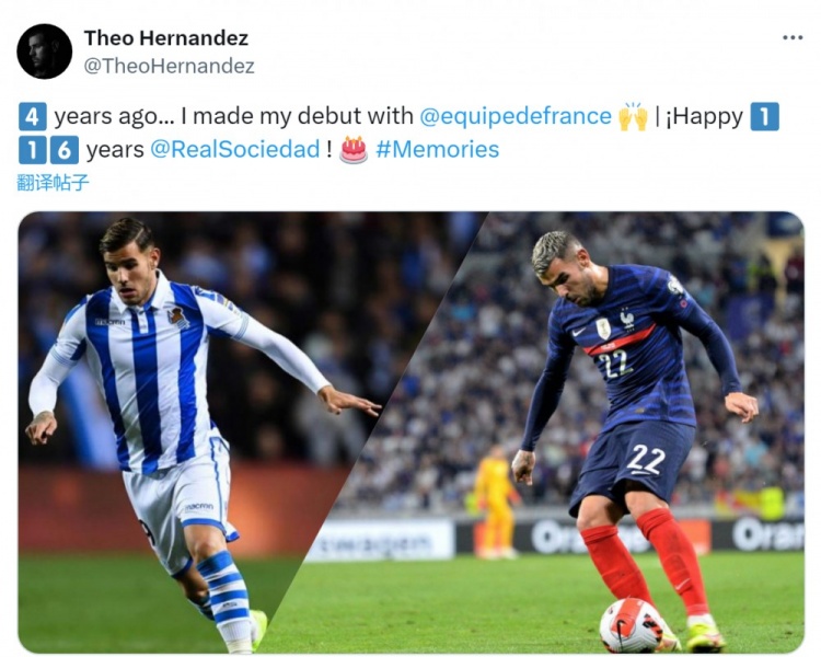 9月7日讯 特奥更新社媒动态,顾虑法国队首秀4周年,并为皇家社会庆生。