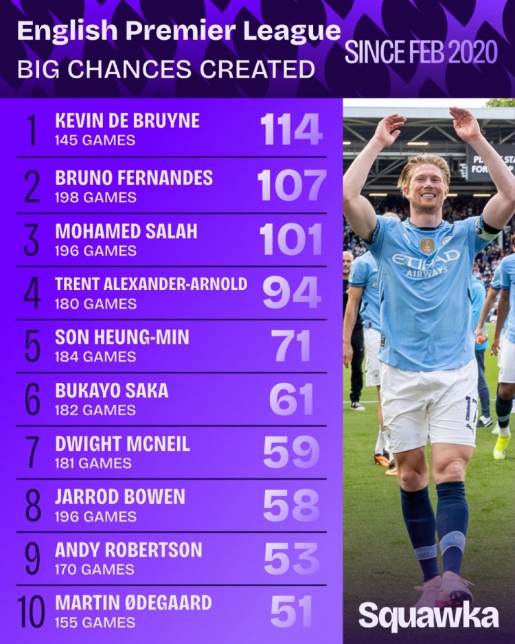 9月7日讯 squakwa统计了自B费加盟曼联以来的英超同时创造紧要契机情况,数据统计领悟B费仅次于德布劳内。
