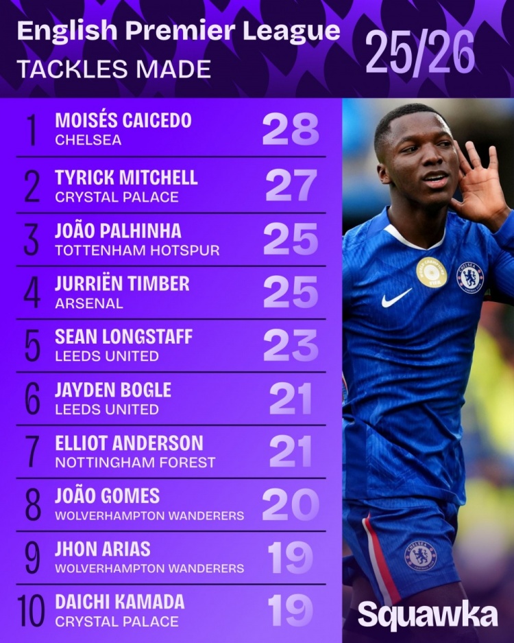 10月7日讯 Squawka统计了本赛季英超抢断榜前十,切尔西中场凯塞多28次位居第一,阿森纳后卫廷伯25按序四。