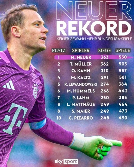 独特穆勒,诺伊尔530场363胜成德甲历史胜场数最多球员