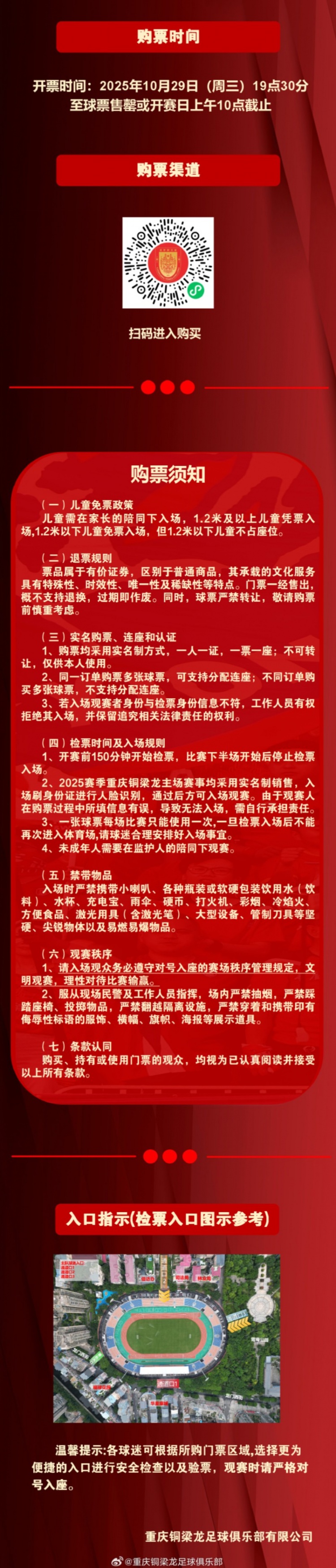 对于本次全场TIFO:请全球于比赛日本日13:30入场,听取DJ和现场职责主说念主员指引,作念好准备并撑执好用于展示的TIFO物品,使用罢了后不要纯粹丢弃。请尽量身着红色捧场服,营造属于重庆的看台红色之海!这面TIFO,是咱们共同的格调,这片红海,是咱们向更高舞台翻涌而去的滔滔波浪!