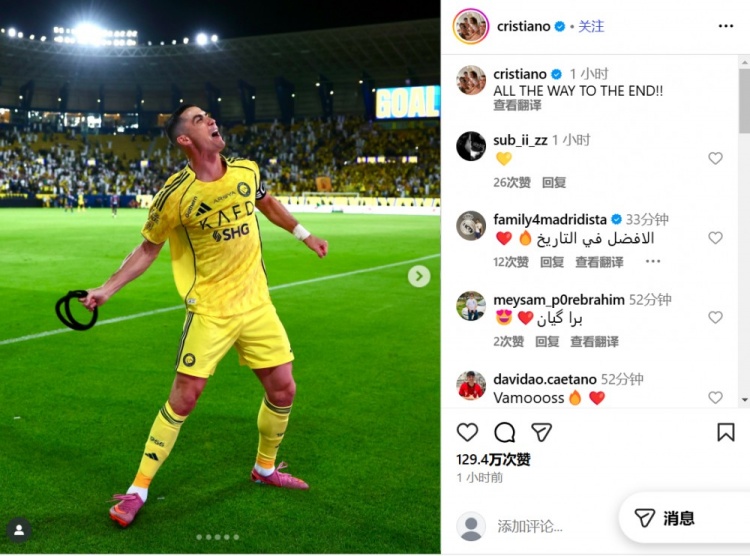 梅开二度助利雅得得手逆转取胜,C罗晒庆祝照:奋战到底