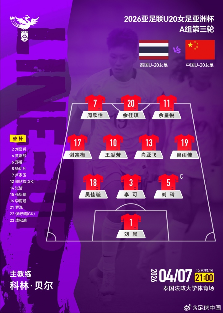 2026亚足联#U20女足亚洲杯# A组第三轮,中国U-20女足对阵泰国U-20女足,中国队公布杆位阵形 。