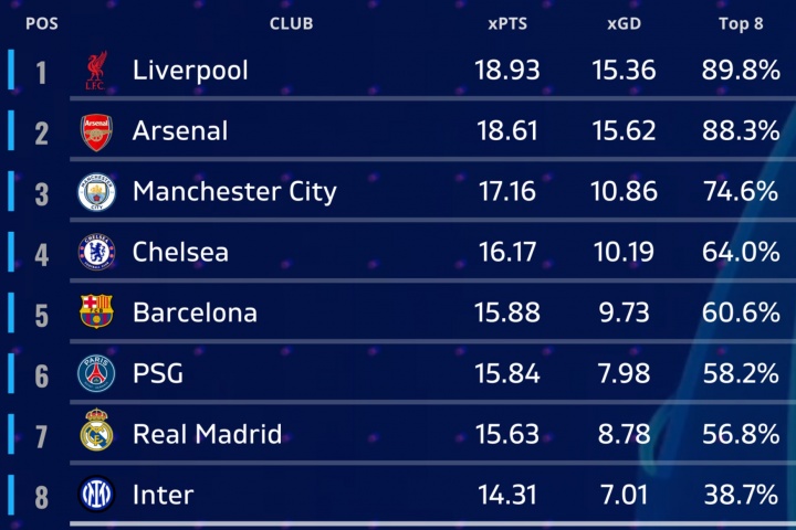 机构臆想联赛阶段(排行、球队、预期积分、预期净胜球、前八概率):