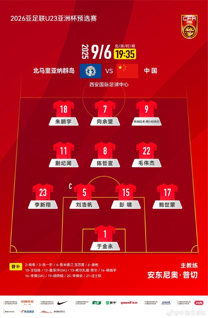 2026亚足联U23亚洲杯预选赛第二轮,北马里亚纳群岛队VS中国队,中国队首发名单出炉!