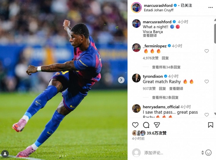 巴萨生存初次参与进球,拉什福德社媒晒照:多棒的夜晚!