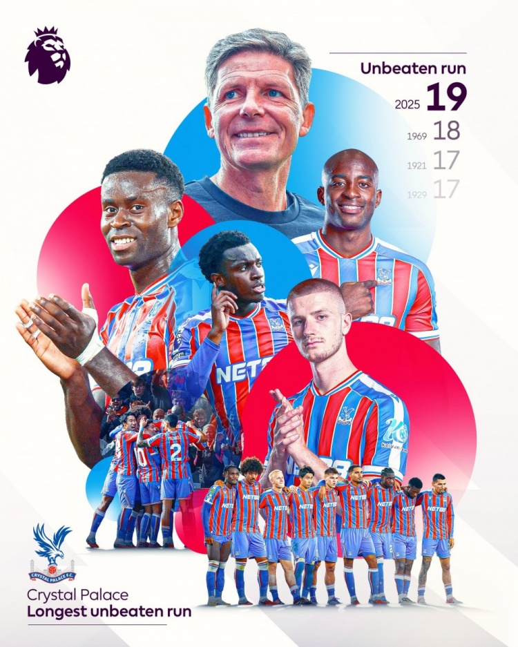 据英超官方统计,水晶宫各赛事19场不败,创造队史最长不败记载。