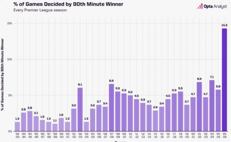 据统计,此占比数据是此前英超任何一个赛季的两倍,此前最高的是23/24赛季,占比7.1%;上赛季90分钟后打进制胜球的比赛占比为5.8%。