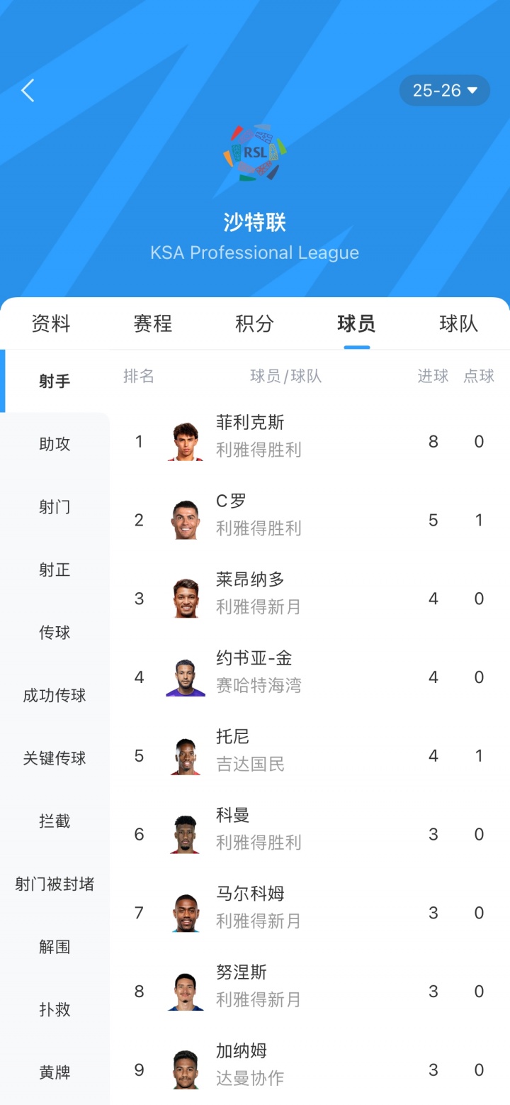 至此,菲利克斯在沙特联5轮杀青了2次帽子戏法,1次梅开二度,攻入8球暂时领跑弓手榜。C罗打入5球位居第2。