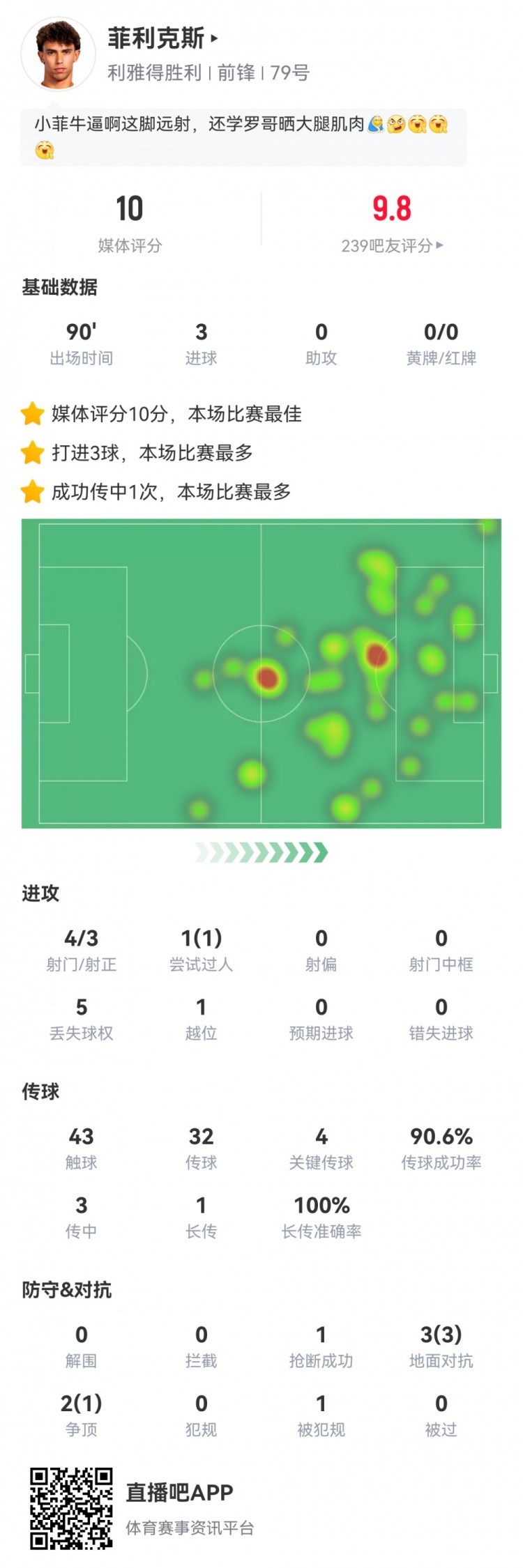 戴帽!菲利克斯数据:4射3正3进球,4次要害传球,获评10分满分
