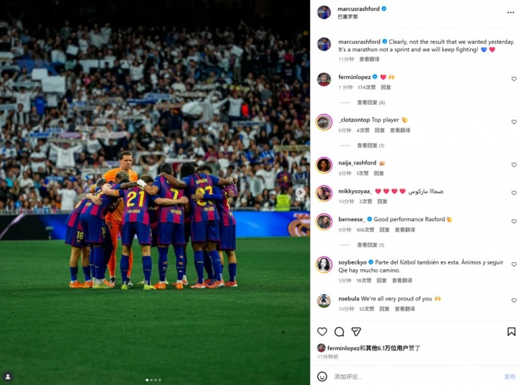 本场比赛拉什福德首发出场送出助攻,赛后他也在社媒晒出全队合照,配文写说念:“显然昨天的比赛效果不是咱们思要的,但联赛是一场马拉松而不是短跑,咱们会赓续拼搏!”