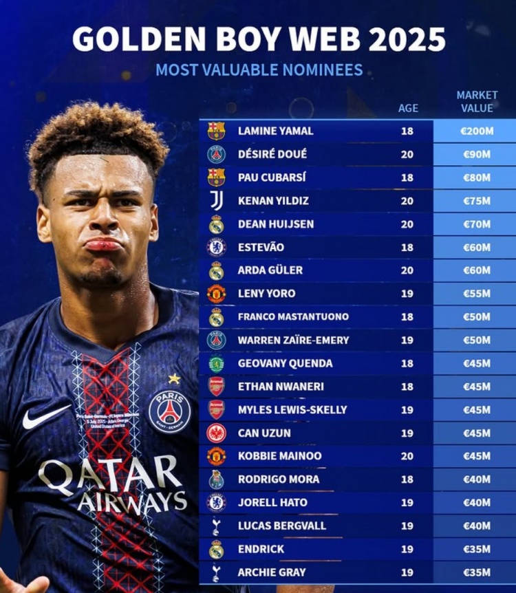 2025金童奖候选身价榜:亚马尔2亿欧 杜埃、伊尔迪兹、赫伊森在列