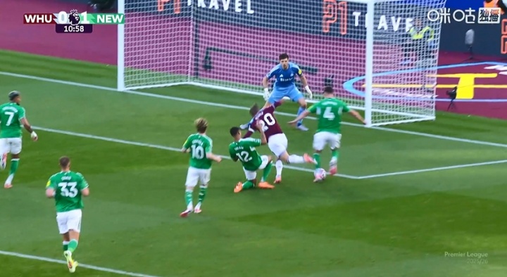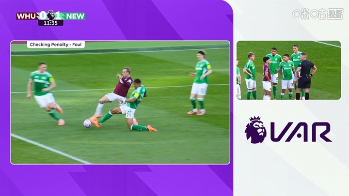 比赛第11分钟,佳夫犯规送点,经VAR介入,主裁场边不雅看回放后阐发佳夫触球,点球取消,纽卡仍1-0培植西汉姆。
