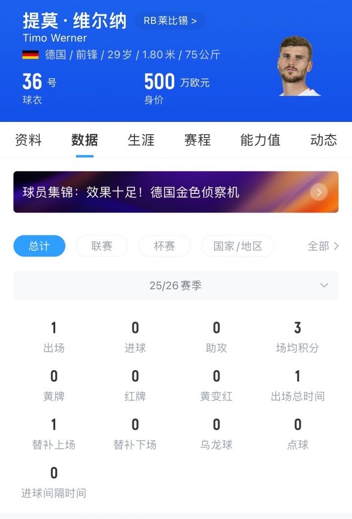 维尔纳现年29岁,他与莱比锡的协议2026年到期,现身价500万欧。
