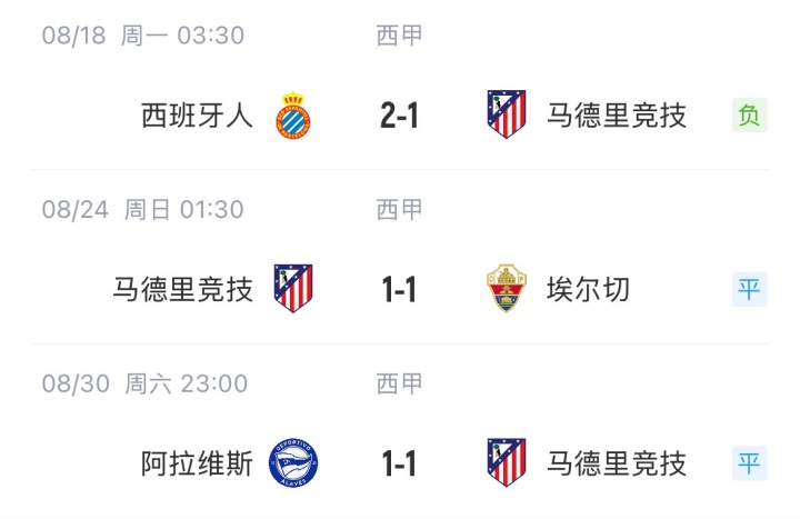 马竞首轮1-2遭西班经纪东谈主逆转,第二场1-1战平埃尔切。值得一提的是,马竞三场齐是先进球。