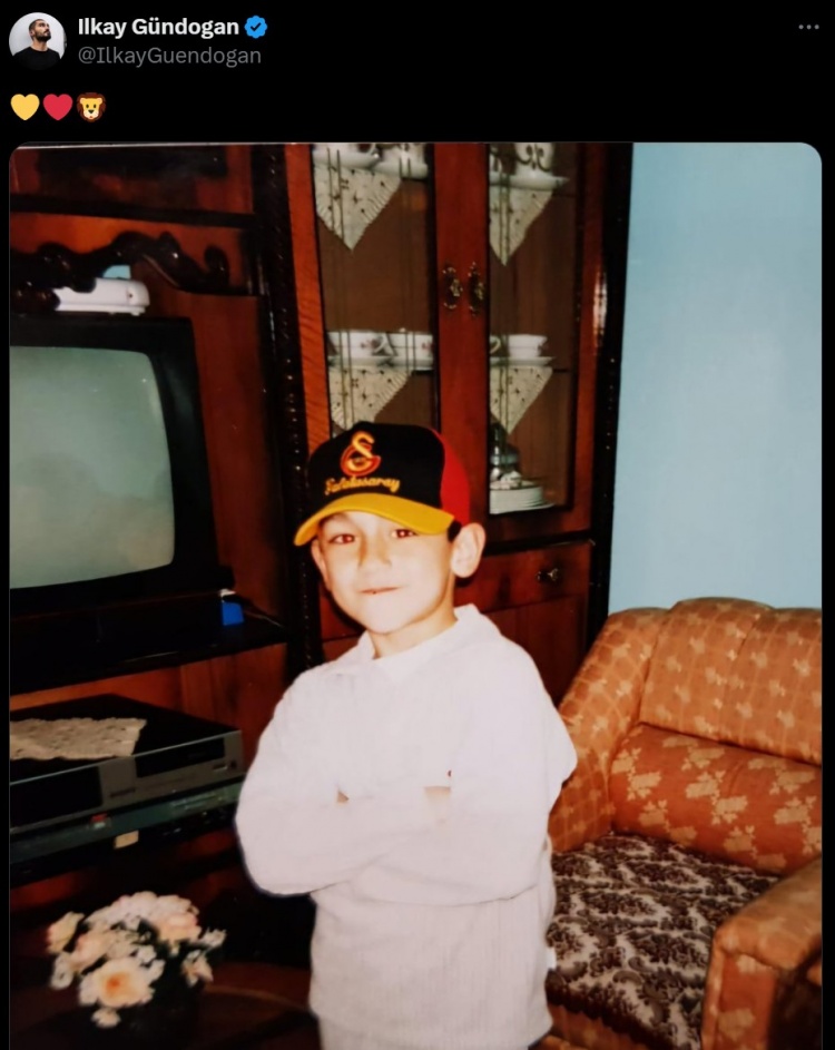 儿加梦!京多安社媒晒头戴印有加拉塔萨雷队徽帽子的童年照