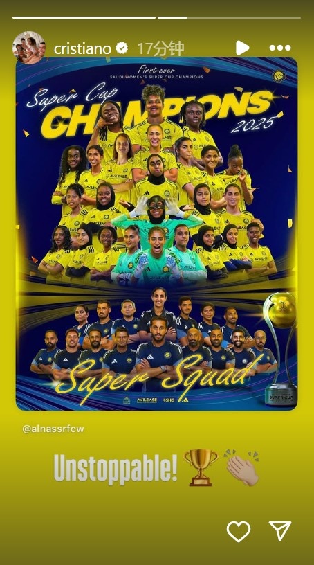 赛后,利雅得胜仗男足球员C罗更新社媒为利雅得胜仗女足奉上道喜,他晒出夺冠海报,同期配文:势不成挡!