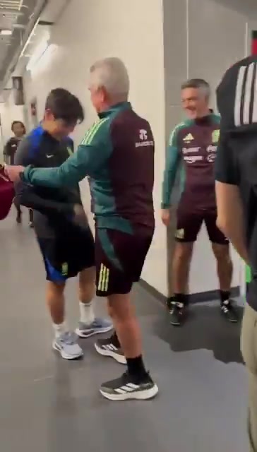 9月9日讯 足球友谊赛,韩国队将对阵墨西哥队。比赛之前,李刚仁与恩师哈维尔-阿吉雷相逢。