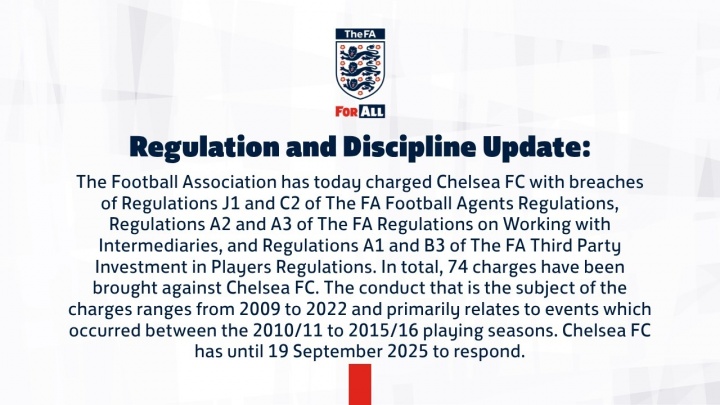 英格兰足球总会本日对切尔西足球俱乐部建议指控,其违背《英足总足球牙东谈主条例》J1和C2条件、《英足总中介互助条例》A2和A3条件,以及《英足总第三方球员投资条例》A1和B3条件。切尔西俱乐部共濒临74项指控,触及2009年至2022年技巧的违纪看成,主要汇聚于2010/11至2015/16赛季技巧。切尔西俱乐部需于2025年9月19日前就此作出复兴。