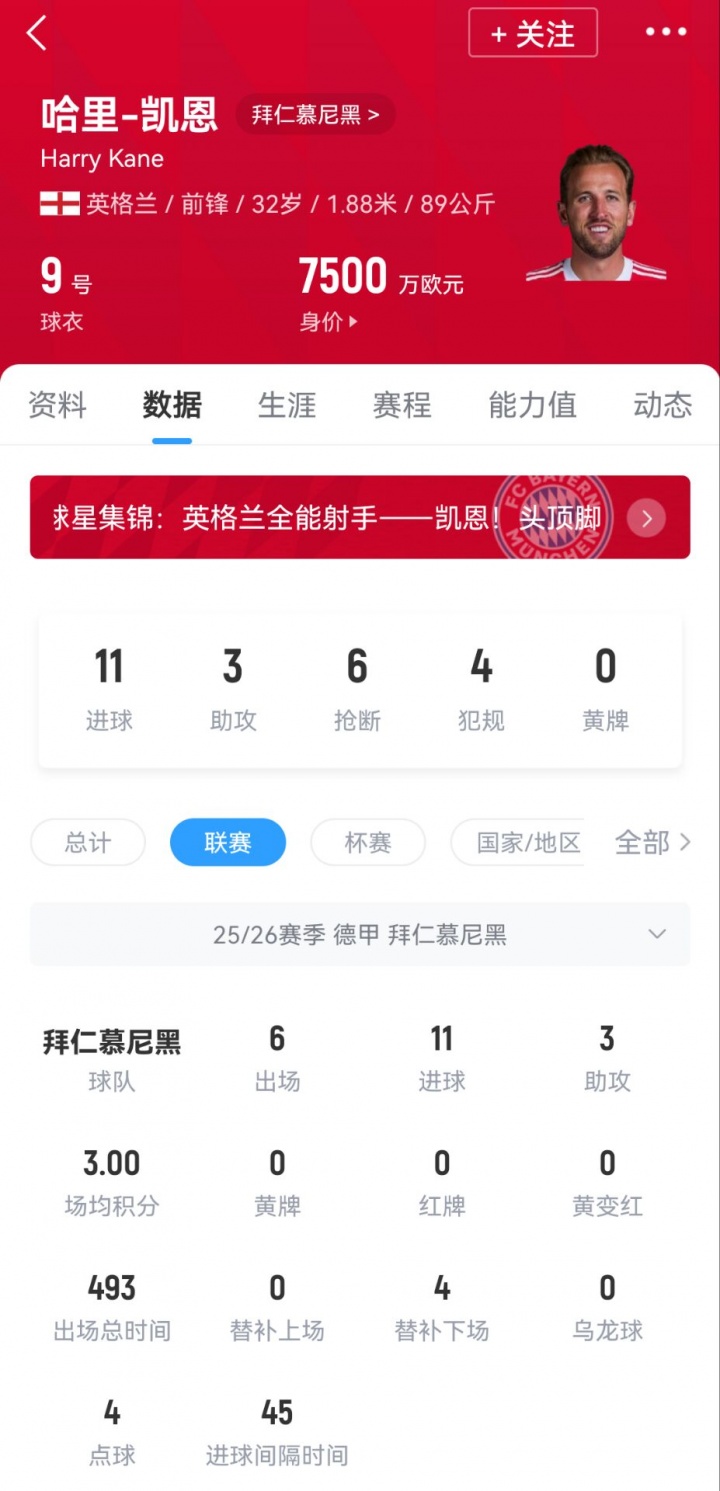 本赛季开赛以来凯恩现象极为火热,为拜仁在联赛中出场6次,孝顺11球3助。目下32岁的凯恩身价为7500万欧元。