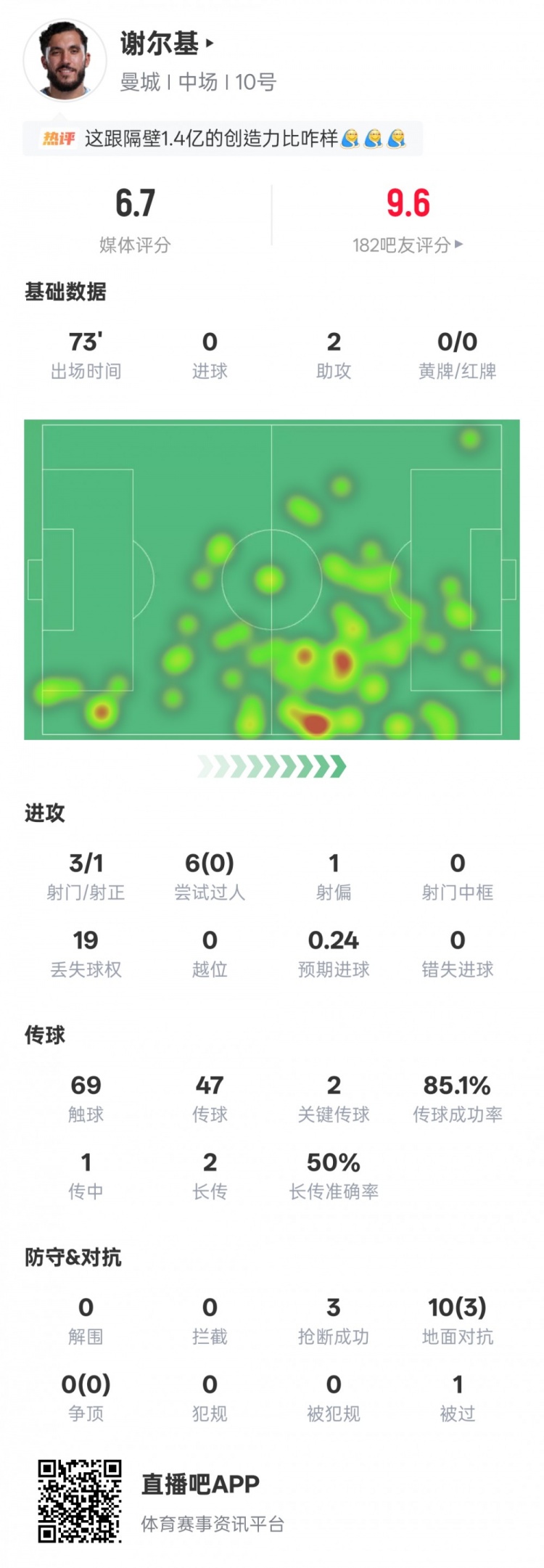 谢尔基本场比赛数据:2助攻2关键传球3抢断,评分6.7