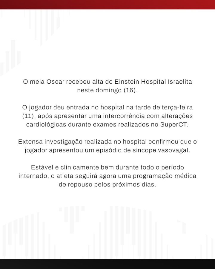 11月16日讯 圣保罗官方发布公告,此前体检时晕厥的奥斯卡照旧获准出院,当今情况精湛。