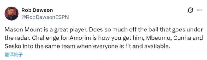 记者RobDawson在酬酢媒体上写说念:“芒特是一位相配优秀的球员。他在无球情景下作念出了许多孝顺,但容易被冷漠。”