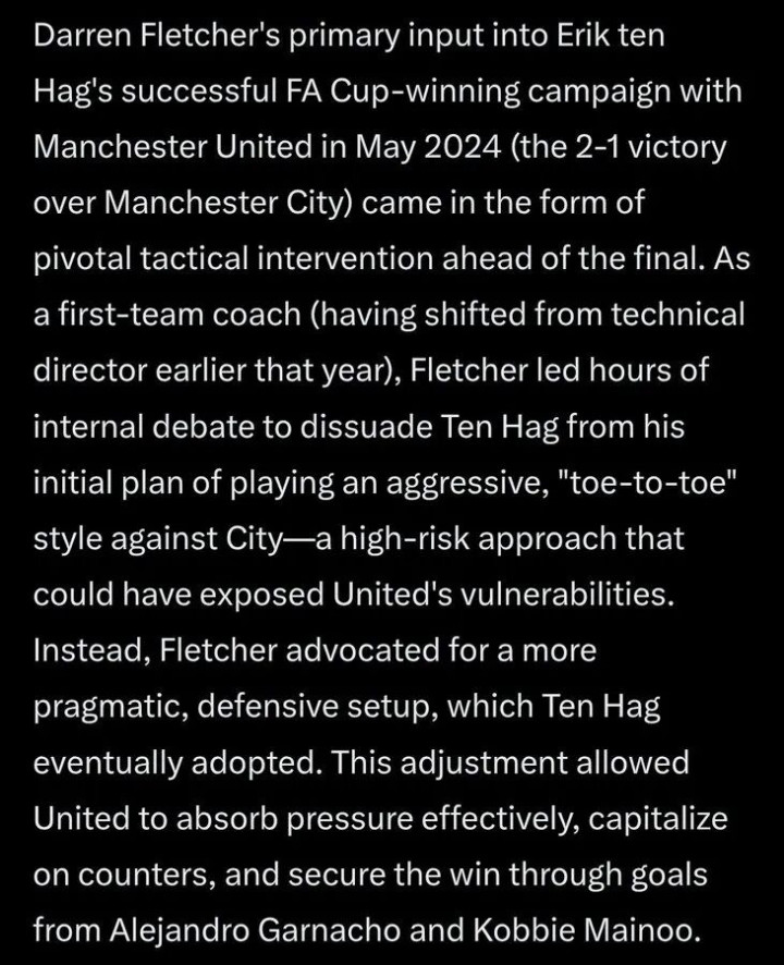 「竞技网」的报谈以至追思到滕哈格带队夺取足总杯决赛的时候,称那时的注意反击计策出自弗莱彻的建议。
