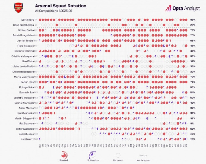 阿森纳本赛季各项赛事总出场时间占比: