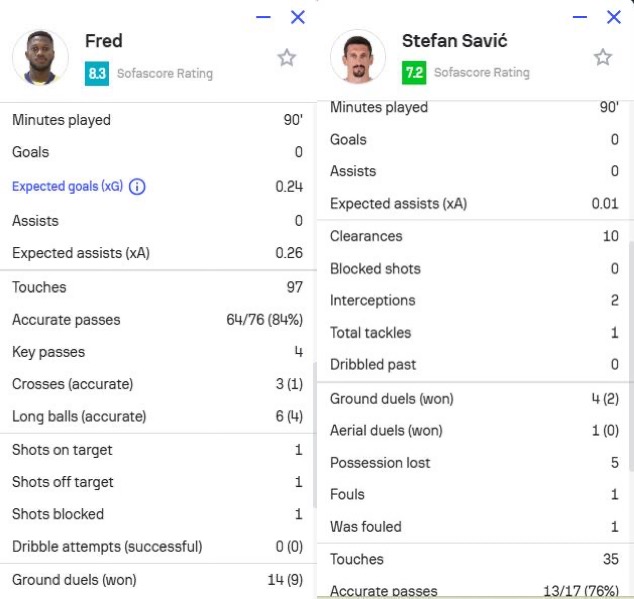 此外,曼联旧将弗雷德(费内巴切)和曼城旧将萨维奇(特拉布宗体育)也皆在本场比赛打满全场,弗雷德还获评8.3分全场第二高。