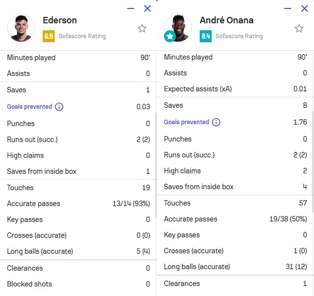本场比赛,埃德森1次扑救(1次扑救禁区内的射门)、2次奏效出击,19次触球,5次长传4次奏效,获评6.9分。奥纳纳8次扑救(4次扑救禁区内的射门)、2次奏效出击、2次高球阻止,57次触球,31次长传12次奏效,1次突围,获评8.4分全场最高。